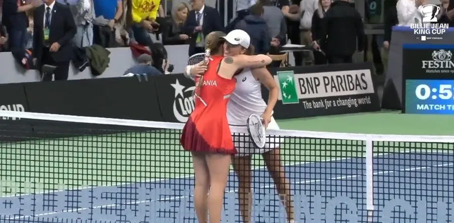 Andreea Prisacariu se îmbrățișează la fileu cu Iga Swiatek