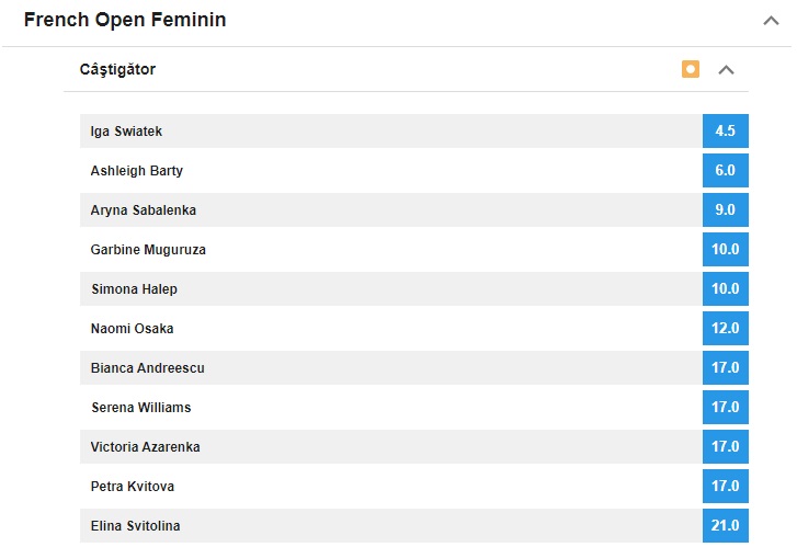 Iga Swiatek (Polonia), campioana en-titre de la Roland Garros, pleacă cu prima șansă în acest an, potrivit bookmakerilor care i-au oferit cota 4.5. A doua favorită la câștigarea turneului parizian este liderul mondial Ashleigh Barty (cotă 6.0), iar pe locul al treilea se situează Aryna Sabalenka din Belarus (cotă 9.0).