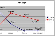 Irina Begu are și ea parte de un sezon pe zgură foarte bun, net superior celui de anul trecut. A început prost, fiind eliminată în primul tur la Praga, după ce anul trecut jucase semifinală într-o competiție de aceeași categorie, la Oeiras. Apoi, însă, a urmat o ascensiune remarcabilă. A jucat „sferturi” la Madrid (anul trecut a fost eliminată în turul 2), apoi „optimi” la Roma (anul trecut nici măcar n-a participat), iar la Roland Garros a urcat în turul 3, unde a fost eliminată de favorita numărul 4, Kvitova (anul trecut n-a ajuns pe tabloul principal, fiind eliminată în calificări).
