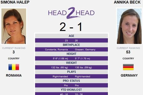 Nemțoaica în vârstă de 20 de ani a pus mâna pe primul titlu WTA chiar la ultima competiție a sezonului trecut, în urmă cu două luni, în Luxemburg. Dacă Simona joacă în premieră la Shenzhen, adversara ei cunoaște fiecare tușă a terenurilor. Annika s-a calificat în semifinalele din 2014 pe hardul asiatic, iar în careul de ași a pierdut în fața celei care a devenit campioană a doua zi, Na Li (China). Despre Annika Beck ar mai fi de notat că are un forehand puternic și le-a învins în 2014 pe Eugenie Bouchard (7 WTA) și pe… Simona Halep (3 WTA). Constănțeanca nu-și amintește cu plăcere de acel meci, din turul doi la Hertogenbosh (Olanda). Halep a câștigat primul set cu 7-5 și se afla în control total, dar durerile la omoplat au forțat-o să se retragă, la 3-2 pentru Beck în manșa secundă.