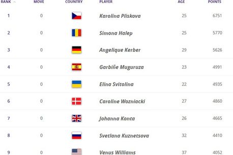 Top 10 WTA este completat de Angelique Kerber (Germania, locul 3), Garbine Muguruza (Spania, locul 4), Elina Svitolina (Ucraina, locul 5), Caroline Wozniacki (Danemarca, locul 6), Johanna Konta (Marea Britanie, locul 7), Svetlana Kuznețova (Rusia, locul 8), Venus Williams (SUA, locul 9) și Agnieszka Radwanska (Polonia, locul 10).