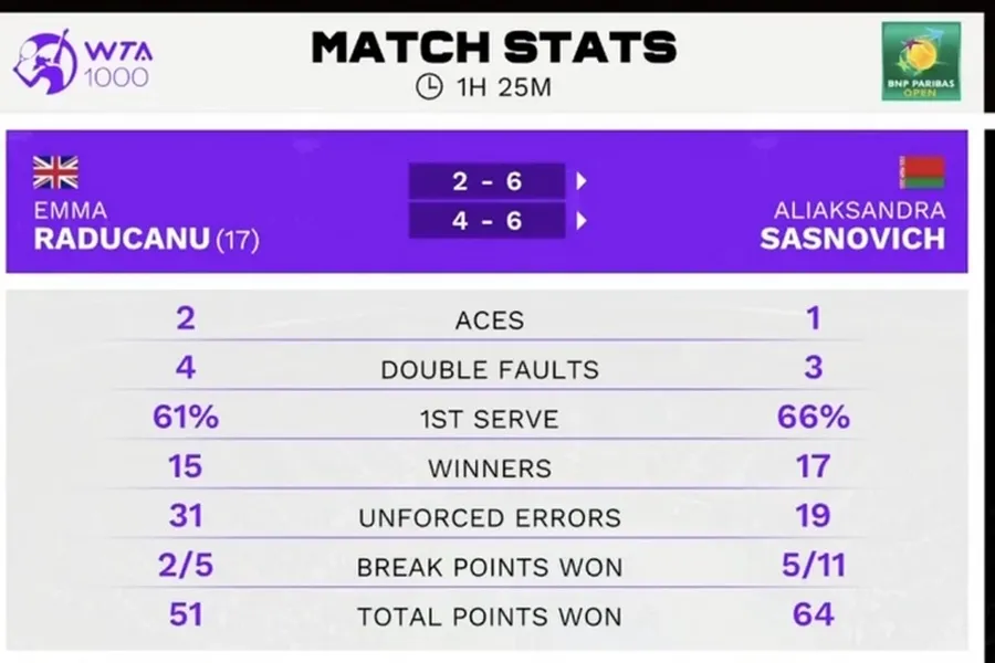 Emma are acum un statut diferit, de cap de serie la turneele importante, care s-a dovedit a fi o povară suplimentară la Indian Wells! Dacă Răducanu a jucat sub presiune, Sasnovich nu a avut nimic de pierdut, a lovit mingea curajos și a destabilizat-o pe britanica de origine română: 2-6, 4-6 după o oră și 26 de minute. Așa că duelul dintre Emma Răducanu și Simona Halep nu va mai avea loc, constănțeanca duelându-se cu Aliaksandra Sasnovich pentru un loc în optimile turneului californian.