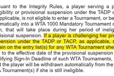 „Dacă o jucătoare contestă suspendarea provizorie, poate rămâne pe listă la orice turneu WTA la care s-a înscris înainte de data intrării în vigoare a suspendării provizorii. Jucătoarea va fi retrasă automat din turneu dacă rămâne neeligibilă”, se arată în regulament.