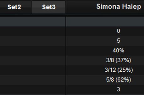 Statistica setului doi, la serviciu, este dură pentru Simona: doar câte trei mingi câștigate și pe prima și pe a doua minge
