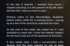 „Eu mă bucur că are un antrenor în acest moment. Mai mult, n-aș putea să spun în clipa de față în legătura cu viitorul colaborării celor doi. Din punctul meu de vedere, există o diferență importantă între ceea ce a însemnat Cahill și ce poate însemna Mouratoglou.