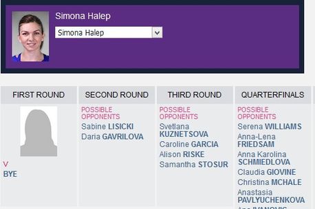 Aventura Simonei la turneul dotat cu 2,4 milioane de euro începe în turul secund, fază în care eleva lui Darren Cahill este calificată direct grație statutului de favorită numărul 6. Iar primul meci îi rezervă o adversară cu nume, indiferent că aceasta va fi Sabine Lisicki (Germania, 44 WTA) sau Daria Gavrilova (Australia, 32 WTA). Astfel, Halep își va afla viitoarea adversară din turul secund marți, atunci când este programat meciul Lisicki – Gavrilova.