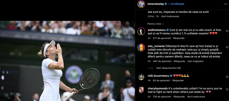 Stau și încerc să înțeleg, dar îmi este realmente imposibil să înțeleg așa ceva. Stau și mă întreb, de ce o așa mare diferență de tratament și judecată? Nu găsesc și nici nu cred că poate exista un răspuns logic. Nu poate fi decât rea-voință din partea ITIA, organizația care a făcut absolut totul să mă distrugă, în ciuda evidenței. S-a dorit foarte tare să mi se distrugă ultimii ani din carieră, s-a dorit ceva ce niciodată nu mi-aș fi putut imagina că se poate dori. Am crezut în bine mereu, am crezut în corectitudine, am crezut în bunătate. A fost dureroasă, este dureroasă și poate că va fi mereu dureroasa nedreptatea care mi-a fost făcută. Cum e posibil ca în cazuri identice, întâmplate cam în același timp, ITIA să aibă abordări complet diferite în detrimentul meu? Cum aș putea să accept că WTA și consiliul de jucătoare nu au vrut să-mi redea clasamentul pe care îl meritam?! Am pierdut doi ani din carieră, am pierdut multe nopți în care nu am reușit să adorm, gânduri, anxietate, întrebări fără răspunsuri… Dar am câstigat dreptatea. S-a dovedit că a fost o contaminare și că pașaportul biologic a fost o pură invenție. Și am mai câștigat ceva, sufletul mi-a rămas curat! Simt dezamăgire, simt mâhnire, simt frustrare, dar nu simt răutate nici măcar acum. Sunt recunoscătoare pentru susținerea și iubirea necondiționată a celor care au fost alături de mine în fiecare zi. Vă mulțumesc! În toată răutatea, am avut parte și de iubire, pentru că cei ce mi-au oferit iubire în momentele acelea m-au cunoscut cu adevărat! Poate că asta este cea mai mare victorie! Cum bine știm, în fiecare dimineață răsare soarele pentru toată lumea, dar e bine să răsară găsindu-te cu sufletul împăcat! Și așa sunt eu, împăcată și mândră de ceea ce sunt!””, a scris Simona Halep, pe pagina ei de Instagram, unde beneficiază de o comunitate imensă, de 1,7 milioane de urmăritori.