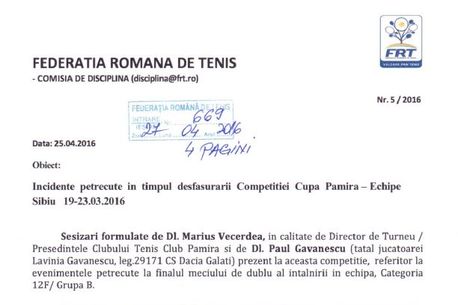 „Dl. Marius Vecerdea, în calitate de Director de Turneu și președinte al clubului CS Tenis Club Pamira – Sibiu, club afiliat la FRT, nu a colaborat politicos și regulamentar cu un oficial al FRT (arbitrul principal), s-a manifestat ca un spectator și nu ca un Director de Turneu.
