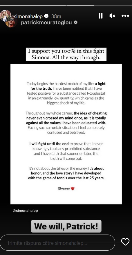După ce Patrick Mouratoglou i-a spus „Te susțin sută la sută în această bătălie. Până la capăt!”, Simona Halep a decis să meargă în continuare pe mâna francezului: „Așa vom face, Patrick!”, a răspuns Halep pe Instastory.