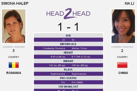 Halep are cu 10 ani mai puțin decât Na Li, jucătoare cu care se află la egalitate în dreptul rezultatelor directe. Simona s-a impus în primul tur la US Open 2011 (hard), cu scorul de 6-2, 7-5, în timp ce chinezoaica a câștigat în manșa secundă la Wimbledon 2013, 6-2, 1-6, 6-0.