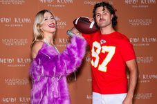 Eugenie a îmbrăcat o rochie-mini clasică cu franjuri, cu paiete deschise la spate, asortată cu cizme argintii strălucitoare până la genunchi. Jack, pe de altă parte, s-a îmbrăcat în echipamentul echipei Kansas City.