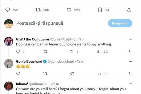Eugenie Bouchard a avut o reacție sarcastică pe contul ei de Twitter, în seara în care Simona Halep a primit teribila veste: „Mi s-a spus să nu postez astăzi!”, a scris Bouchard pe Instagram! Cu alte cuvinte, canadianca a dorit să transmită că ar critica-o dur pe Simona, dar se abține. Românii au sărit în apărarea lui Halep: „Nu știam că mai joci tenis!”, a comentat o fană pe nume Iuliana, dar Eugenie a continuat ironiile: „Mulțumesc că mă urmărești, baby!”.