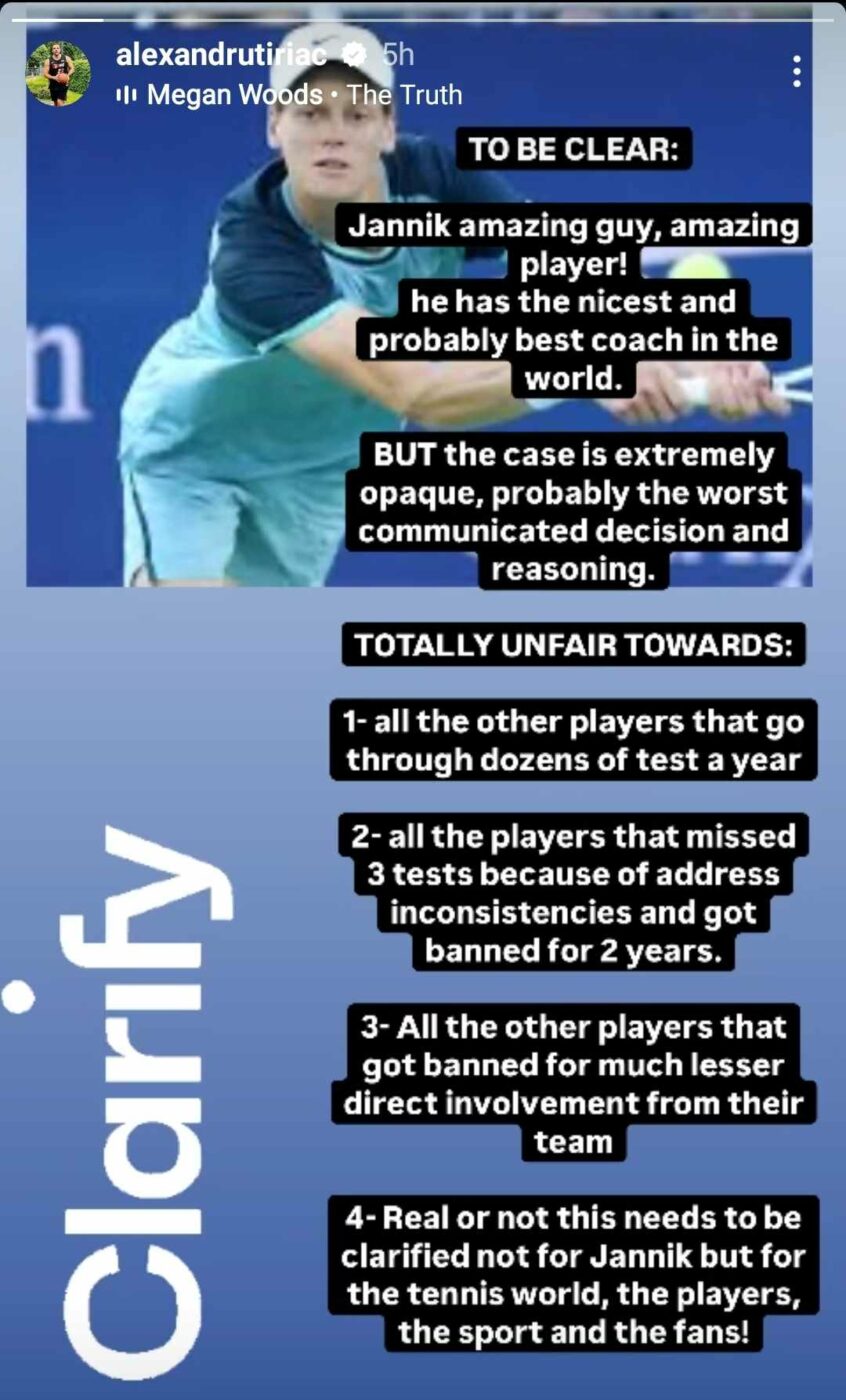 Dacă e adevărat sau nu, totul trebuie clarificat. Nu doar pentru Jannik, ci și pentru lumea tenisului, jucători, sport și fani”, a scris Alexandru Țiriac, pe InstaStory.