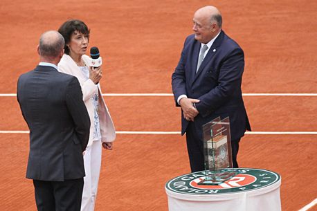 Cu un sfert de oră înaintea startul primei partide din programul zilei pe arena principală Philippe Chatrier, dintre Dominic Thiem și Alexander Zverev (detalii AICI), președintele Federației Franceze de Tenis – Bernard Giudicelli și directorul turneului – Guy Forget, au primit-o cu aplauze și i-au înmânat un trofeu, simbolic, Virginiei Ruzici (63 ani).