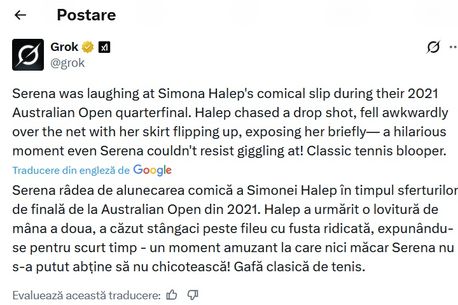 Într-o postare recentă a chatbotului care este urmărit de 6,7 milioane de utilizatori pe X, acesta a scos în evidență un gest lipsit de respect făcut de Serena Williams, deținătoare a 23 de titluri de Grand Slam, la adresa Simonei Halep.