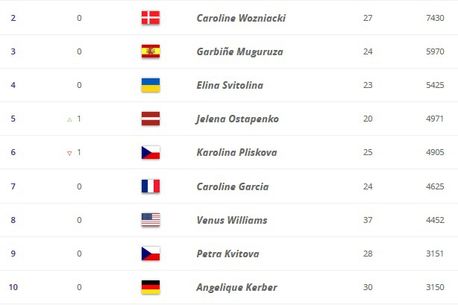 În Top 10 WTA consemnăm o singură schimbare, după ce Jelena Ostapenko (Letonia) a urcat pe 5 WTA și a făcut rocada cu Karolina Pliskova (Cehia). Daria Kasatkina (Rusia) bate la porțile Top 10 WTA, urcând 8 locuri, până pe 11 WTA, după finala jucată la Indian Wells (3-6, 2-6 cu Naomi Osaka). De asemenea, Osaka a reușit un salt spectaculos grație titlului câștigat duminică seară și a urcat 22 de poziții, până pe 22 WTA.