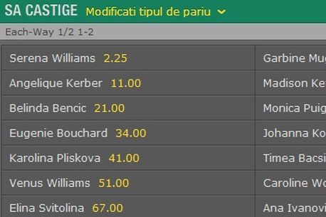 Surprinzător sau nu, Simona Halep o devansează pe Angelique Kerber în topul cotelor de la US Open! Nemțoaica a învins-o pe Simona sâmbătă, în semifinalele de la Cincinnati, scor 6-3, 6-4, dar bookmakerii nu au fost impresionați: Kerber a primit o cotă de 11,00 la câștigarea trofeului. De asemenea, Agnieszka Radwanska (Polonia, 4 WTA), o altă tenismenă care se află peste Simona Halep în clasamentul WTA, este spulberată de româncă în ierarhia întocmită de casele de pariuri. Poloneza are o cotă de 34,00, fiind devansată și de jucătoare precum Madison Keys (cotă 15,00), Belinda Bencic (cotă 21,00) și Monica Puig (cotă 29,00).