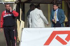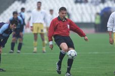 Actualul expert în pariuri Florin Chivulete supraveghează cu atenție mingea disputată de Florin Tameș și Tibi Bălan