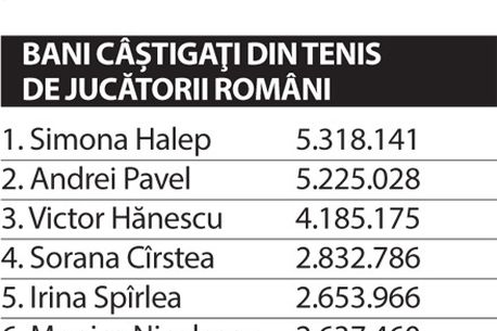 Cu această sumă de bani, Simona a trecut pe primul loc în topul all-time al banilor obținuți din tenis de jucătorii români, cu 5,3 milioane de dolari. Lider era până săptămâna trecută Andrei Pavel, cu 5,2 milioane de dolari. În acest caz trebuie făcute însă câteva mențiuni. În primul rând, valoarea premiilor la toate turneele au crescut considerabil de la un an la altul. Spre exemplu, Ilie Năstase a primit numai 3.000 de lire sterline pentru finala disputată în 1972 cu Stan Smith, pe care a catalogat-o ca fiind cea mai frumoasă din întreaga carieră. Apoi, ierarhia nu ține cont de rata inflației. Nasty a adunat din tenis, în anii ’70, puțin peste 2 milioane de dolari, o cifră pe care un jucător o obține acum cu un singur titlu la Wimbledon. În urmă cu 40 de ani, dolarul avea însă altă valoare. Actualizat cu rata inflației, de atunci și până azi, atunci valoarea premiilor câștigate de Năstase ar fi în jurul a 10 milioane de dolari, singurul care a reușit să ajungă și numărul 1 mondial, plecând în tenis din România.