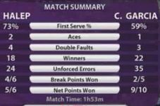 A doua jucătoarea a lumii a vrut să închidă repede punctele, în special la retur, forțând atât cu dreapta, cât și cu reverul. În condițiile date, serviciul s-a aflat și el la înălțime, cu un procentaj de 73% pe prima minge, cu 14% mai bun decât al Carolinei. Franțuzoaica este recunoscută ca o jucătoare ofensivă, dar Simona s-a apropiat de ea în privința mingilor direct câștigătoare: 18-22. Cifrele exprimă o agresivitate sporită din partea constănțencei, dar și un risc în plus, care i-a adus 4 duble greșeli.
