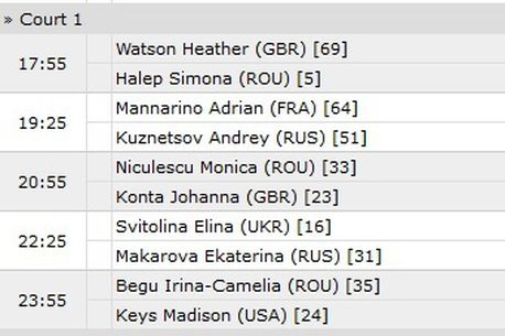 Halep, favorita 5 a concursului feminin, se va duela cu Heather Watson (Marea Britanie, 69 WTA) într-un meci care va începe de la ora 18:00. Simona s-a mai întâlnit de două ori cu Heather, iar constănțeanca și-a adjudecat ambele partide: 4-6, 6-4, 6-2 în primul tur la US Open 2013 (hard) și 6-2, 6-4 în turul doi la Madrid 2014 (zgură). Dacă obține victoria, semifinalista en-titre o va întâlni în „sferturi” pe câștigătoarea meciului Agnieszka Radwanska (Polonia, 2 WTA) – Timea Bacsinszky (Elveția, 20 WTA).