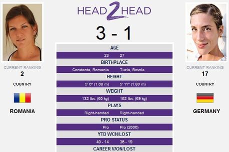 • Ascendentul moral: Simona a câștigat ultimele trei meciuri în fața Andreei, singurele care au contat cu adevărat în circuit: 6-3, 6-3 în finală la Nurnberg 2013 (zgură), 7-6, 6-3 în turul doi la Tokyo 2013 (hard) și 6-2, 7-6 în semifinală la Roland Garros 2014 (zgură). Singurul succes al germancei împotriva româncei a avut loc într-un turneu Futures, competiție de nivel inferior, 6-2, 7-6 în sferturi la București 2009 (zgură).