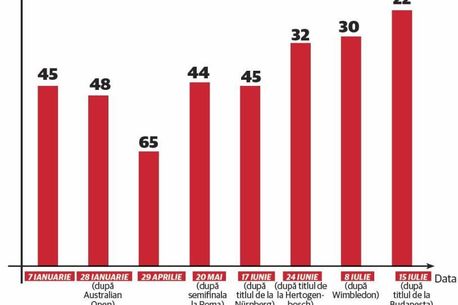Pe 13 mai, chiar în săptămâna în care a început să înșire victoriile în fața celor mai bune jucătoare ale lumii la Roma, Halep se situa pe locul 64. De la „resetul” dat în capitala Italiei, eleva lui Andrei Mlendea a jucat o semifinală cu Serena Williams și a câștigat trei titluri, performanțe în urma cărora atinge cea mai bună clasare a unei reprezentante după perioada Spârlea – Dragomir. Într-un clasament al anului, Simona a făcut deja pasul în Top 20, până pe locul 18, însă probabil că nu va mai trece mult până când va fi la același nivel și în ierarhia pe baza căreia se fac intrările la turnee. Până la sfârșitul anului, ea mai are de apărat numai 337 de puncte.