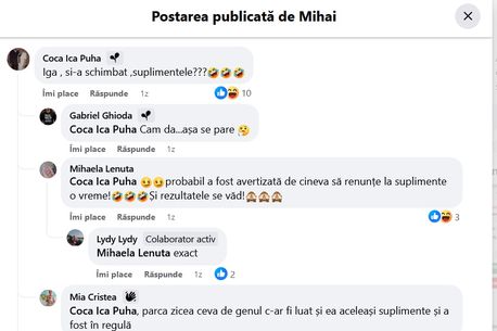 „Și-a schimbat suplimentele?”, „Cam da! Așa se pare!”, „Probabil a fost avertizată de cineva să renunțe la suplimente și rezultatele se văd”, au fost ironile făcute de fanii români la adresa Igăi Swiatek, pe grupul de Facebook „Lumea sportului alb”.