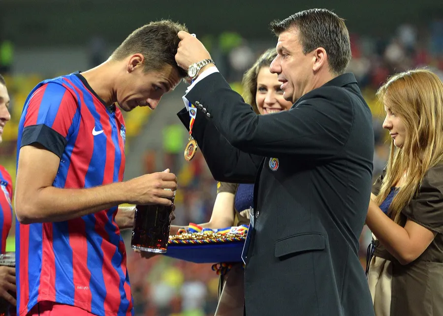 Regretatul Daniel Prodan îl premiază pe Lukasz Szukala după ce FCSB a câștigat Supercupa României în 2013