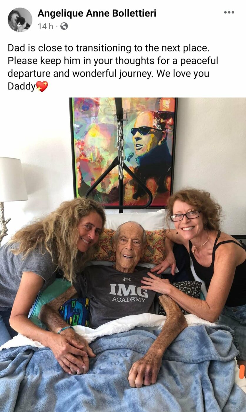 Angelique Bollettieri a postat o imagine sfășietoare cu marele antrenor de tenis, alături de un mesaj la fel de cutremurător: „Tata este aproape de trecerea pe lumea cealaltă. Vă rugăm să-l păstrați în gândurile voastre, pentru a avea o plecare liniștită și o călătorie minunată. Te iubim!”.