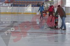 Muncitorii de la patinoarul din Galați aspiră apa rămasă și usucă pistei de beton
