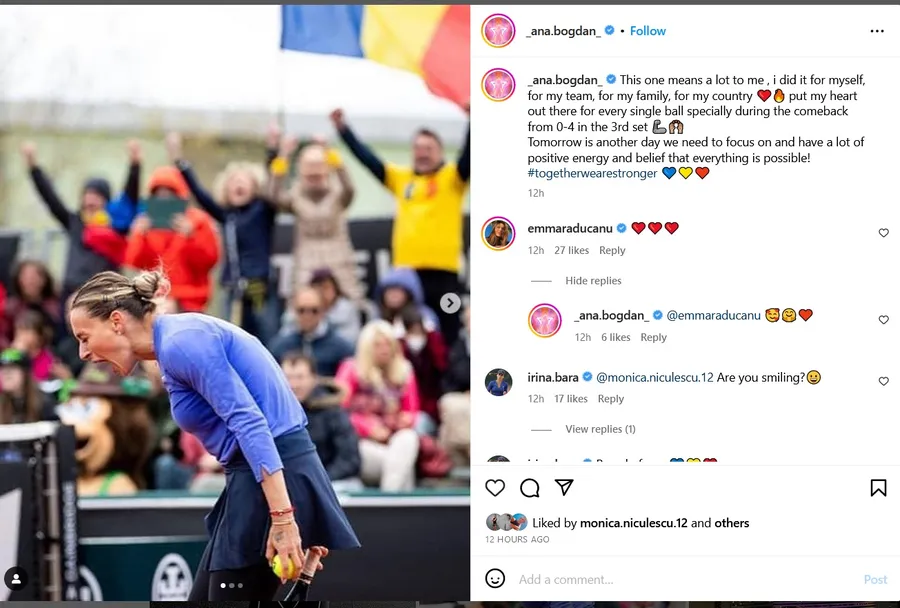 „Asta înseamnă foarte mult pentru mine! Am făcut-o pentru mine, pentru echipa mea, pentru familia mea, pentru țara mea! Am pus inimă pentru fiecare minge, mai ales în timpul revenirii de la 0-4 în setul 3! Mâine este o altă zi pe care trebuie să ne concentrăm și să avem multă energie pozitivă și să credem că totul este posibil”, a fost mesajul Anei Bogdan, la care Emma Răducanu a reacționat imediat.