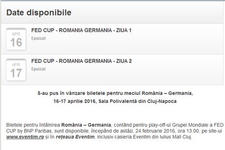 Federația Română de Tenis a anunțat, miercuri, într-un comunicat, punerea în vânzare a biletelor pentru meciul România – Germania, din play-off-ul Grupei Mondiale a FED Cup, care se va desfășura în perioada 16-17 aprilie 2016, la Cluj-Napoca.