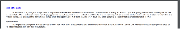 Endeavour este un grup global care deţine mai multe active în domeniul entertainmentului şi sportului, listat la bursa de la New York. Conform informaţiilor vehiculate pe piaţă, Ion Ţiriac câştiga anual, în urma turneului de la Madrid, în jur de 30 de milioane de euro. Potrivit Business Magazin, casa de avocatură Filip & Company a asistat grupul Ţiriac în această tranzacţie, negocierile fiind conduse de Cristina Filip, unul dintre avocaţii de casă a lui Ion Ţiriac. Sursă: Raportul grupului Endeavour de la New York.