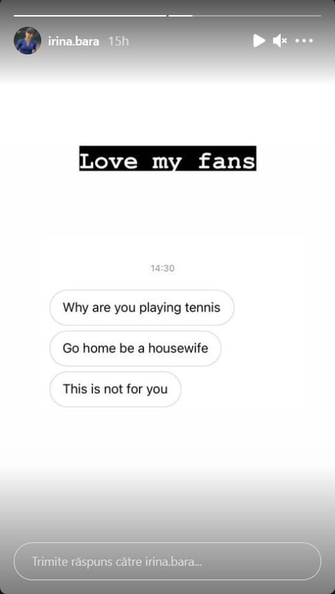 Într-un Instastory publicat după meciul cu Federica Di Sarra, ce a durat nu mai puțin de două ore și 39 de minute, Irina Bara le-a arătat fanilor săi un mesaj incalificabil primit de la un utilizator anonim: