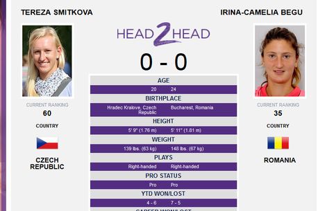 17:15 Irina Begu începe partida la retur și profită de serviciul doi al adversarei pentru a împinge game-ul la egalitate. Nu ajunge însă și la minge de break, Smitkova preluând prima conducerea în partidă: 1-0 pentru reprezentanta Cehiei.