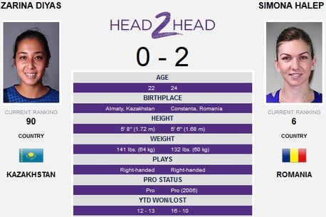 Sportiva noastră știe cum să o învingă pe Zarina Diyas, adversara de miercuri pe care a umilit-o de fiecare dată în cadrul turneelor de Grand Slam. Simona s-a mai întâlnit cu Zarina de două ori în carieră, ambele meciuri fiind câștigate fără drept de apel de româncă: 6-1, 6-4 în turul trei la Australian Open 2014 (hard) și 6-3, 6-0 în optimi la Wimbledon 2014 (iarbă),