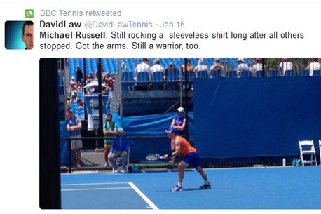 Michael Russell păstrează aceelași look de la debut: maiou care îi pune în evidență mușchii lucrați ai brațelor la 36 de ani, chiar dacă așa cum remarcă și un jurnalist britanic, „mulți alții au renunțat de mult” la o astfel de „extravaganță” – de la Rafael Nadal, la Juan Martin Del Potro. Chiar și Gael Monfils s-a cumințit din punct de vedere vestimentar. Jucător care nu a trecut niciodată mai departe de turul doi la un Grand Slam, americanul a rămas un personaj.