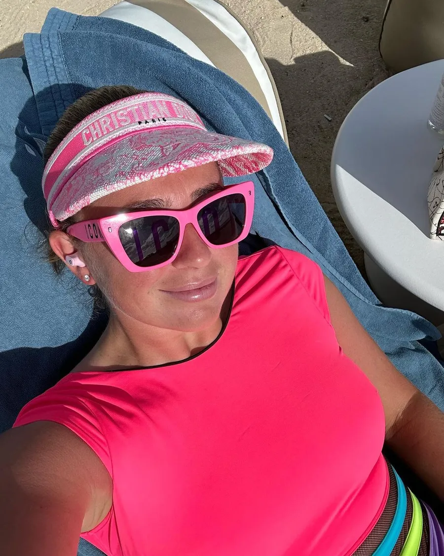 Astfel, Ostapenko și-a făcut apariția pe plaja din Mauritius într-un costum de baie viu colorat, dintr-o singură piesă, protejându-și ochii de razele soarelui cu o pereche de ochelari roz.