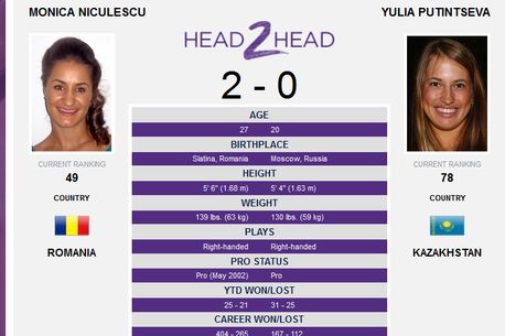 Luptătoarea Monica Niculescu dă deșteptarea pentru fanii români ai tenisului, cu un duel în fața unei jucătoare din noul val, Iulia Putintseva, care nu traversează chiar cea mai bună perioadă. Crescută la Spartak Tennis Club, din Moscova, pe terenurile indoor pe care s-au antrenat, de-a lungul timpului, Anna Kournikova, Elena Dementieva, Anastasia Miskina sau Dinara Safina și Marat Safin, actuala reprezentantă a Kazahstanului nu a mai simțit gustul victoriei pe un tablou principal WTA de la Washington, la început de august.