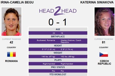 Irina nu are amintiri plăcute din singura întâlnire directă cu cehoaica, pe care a pierdut-o chiar în acest an, la Shenzhen (China), cu scorul de 6-7 (5), 6-4, 6-1. Irina Begu n-a mai atins pană acum turul trei al vreunui turneu de Grand Slam, iar cele mai bune performanțe ale ei sunt: turul doi la Australian Open (2013 și 2015), turul doi la Roland Garros (2011 și 2012), turul doi la Wimbledon (2014) și turul doi la US Open (2012 și 2014).