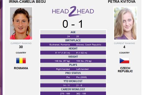 Irina Begu a ajuns în turul trei fără a ceda set la Paris, iar meciul al doilea a părut o adevărată defilare. Irina are încredere, este clar pe o pantă ascedentă și va întâlni o adversară ajunsă la meciul direct în modul „survivor” – cu un joc inconstant, redresat la limită în momentele cheie ale finalului de meci, pentru a evita o eliminare timpurie. Scenariul seamănă mult însă cu cel de la Madrid, ceea ce impune un plus de prudență înaintea duelului cu stângacea numărul unu din tenisul feminin. Kvitova este obișnuită cu gestionarea turneelor de Mare Șlem, a câștigat de două ori la Wimbledon și poate lucra reglajele fine, în special cu ziua liberă între tururi.