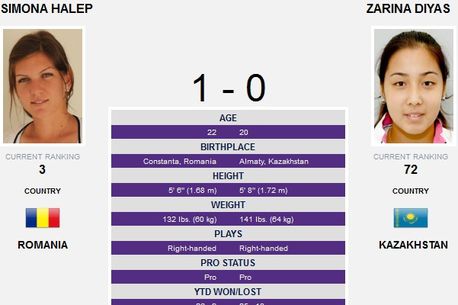 UPDATE 15:25 Statistica meciului care a durat doar 57 de minute. Simona a realizat 17 lovituri câștigătoare și a făcut 9 greșeli neforțate, în timp ce Zarina are 9 winnere și 21 de erori neprovocate.