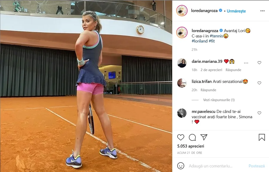 Loredana Groza s-a echipat ca Simona Halep și a mers la tenis, pe terenul de la Stejarii Country Club. Artista a urcat o imagine pe Instagram, spre deliciul fanilor, spunând: „Avantaj Lori! C-așa-i în tenis!”. Fotografia a strâns peste 5.000 de aprecieri, iar fanii Loredanei așteaptă cu nerăbdare un duel cu Simona Halep.