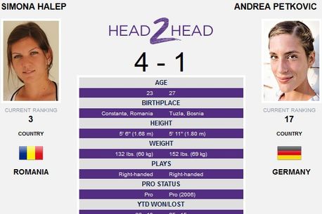 Halep are însă o motivație aparte la turneul dotat cu 2,4 milioane de dolari, ținând cont că la sfârșitul săptămânii poate urca pe locul 2 WTA. Simona trebuie să câștige meciul cu Andrea, dar și pe următoarele două, obținând astfel calificarea în finala care i-ar aduce punctele necesare pentru a o devansa pe Maria Șarapova (2 WTA). Andrea Petkovic a învins-o în turul precedent pe Camila Giorgi (Italia, 31 WTA), scor 5-7, 6-3, 6-3, iar nemțoaica este o veche cunoștință a Simonei Halep. Cele două s-au mai întâlnit de cinci ori în circuit, Simona adjudecându-și patru victorii.