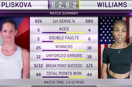 Mașinăria de „winnere” a funcționat perfect, iar Pliskova a „împușcat” nu mai puțin de 25 de lovituri direct câștigătoare în meciul găzduit de arena „Singapore Indoor Stadium”. Williams nu a fost la un nivel chiar atât de slab precum o arată scorul, pentru că a reușit, totuși, 16 lovituri direct câștigătoare, însă americanca a servit extrem de modest. Pliskova, care a primit cadou 6 puncte – în urma unor duble greșeli, a profitat la maximum de slăbiciunea adversarei, iar favorita și-a creat 12 mingi de break, convertind 5 dintre acestea.