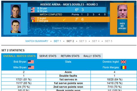 Presa britanică este la picioarele echipei Florin Mergea-Dominic Inglot (27 de ani), cei doi plecând ca favoriți 14 la Melbourne. „Frații Bryan, care s-au impus de șase ori la Australian Open, nu au putut combate combinația jocului în forță al lui Inglot și abilitățile solide de a susține un raliu de pe fundul terenului al minionului român Mergea„, scrie Daily Mail. Inglot și Mergea i-au surclasat pe americani la categoriile cele mai importante ale statisticii: ași (9-5), eficiența serviciului (76% față de 73% puncte câștigate cu primul serviciu și, respectiv, 73% la 45% puncte câștigate cu mingea a doua), lovituri câștigătoare (46 la 22).