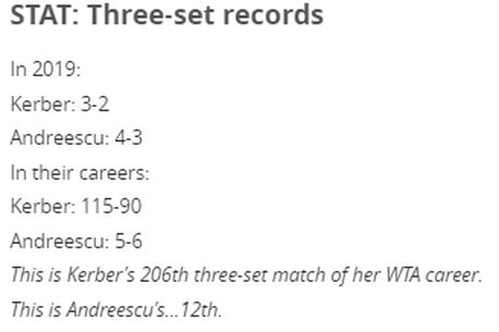 â–º Conform unei statistici WTA, Bianca se află abia la al 12-lea set decisiv în circuit. În schimb, Kerber joacă setul decisiv cu numărul 206! Andreescu deschide actul trei cu un game câștigat pe propriul serviciu.