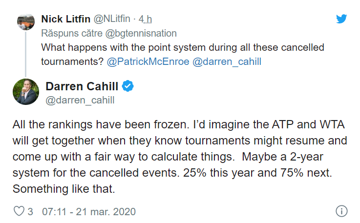 „Toate clasamentele au fost înghețate. Mă gândesc că ATP și WTA se vor reuni atunci când turneele se vor relua și vor găsi o metoda de calcul. Poate un sistem pe ultimii doi ani pentru evenimentele anulate. 25% pentru acest an și 75% pentru anul viitor. Ceva de genul”, a scris Darren Cahill, pe Twitter.
