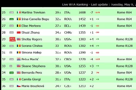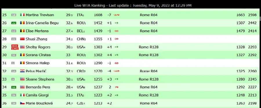 Sorana Cîrstea are în acest moment 1.302 puncte în visterie, în timp ce Simona Halep a rămas cu 1.290 de puncte. Eleva lui Patrick Mouratoglou a pierdut cele 60 de puncte acumulate anul trecut la turneul de la Roma, unde s-a oprit în turul al doilea (6-7, 3-6 cu Danielle Collins).